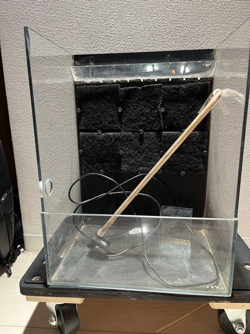 - 水槽の他にフィルター、エアポンプがついていて子供の水槽デビューに購入しました。 グッピーのオス2匹だけだし、大きさは問題ないと思うし、フィルターが目立たないのも良い、と思いましたが底床を入れると簡単には外せないのと、いかんせん水の量がないので中身を動かすと汚れが一瞬で広がり、とてもじゃないですが1/4や1/3の水換えでどうこうできるレベルではなくなります。 やはり初心者だからこそある程度は大きな水槽でないと厳しいです。 ベアタンクならアリかもしれませんが、バクテリアの住処があのフィルターだけでは心許ない気もします。 あと、付属のフィルターではグッピーには水流がキツイ気がしましたので結局底面フィルターでリセットし、それでも水が渦巻くのでシャワー部にいくつかチューブを付けて水流緩和させて使っています。 水流が苦手な魚を検討されているなら、ここまで小さいと逃げ場が難しいかも、と思いました。